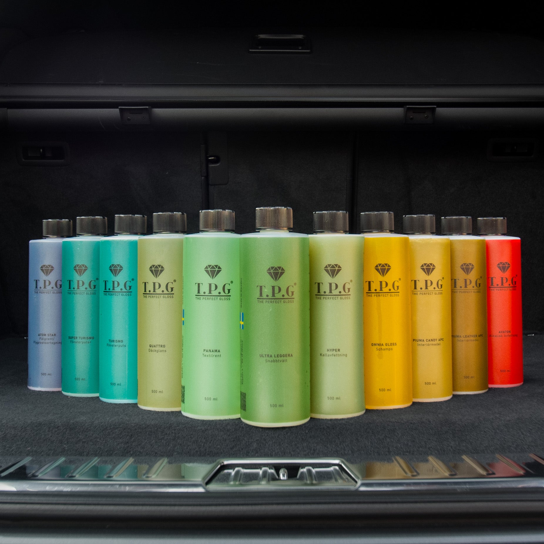 11 flaskor. Full kontroll. Från asfalt till glas, däck, interiör och lack – det här är hela TPG-sortimentet i ett komplett kit.